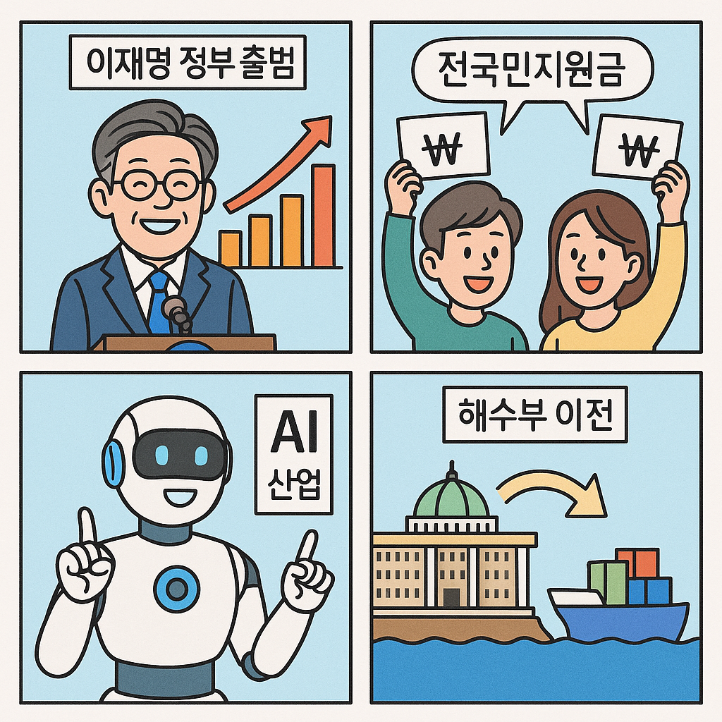 이재명 정부 출범 이후 한국 사회에 나타난 핵심 변화들을 4컷 만화로 쉽고 심플하게 정리해봤어요.