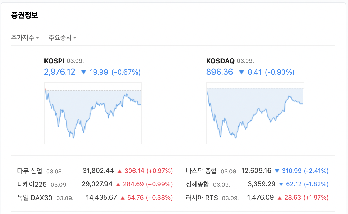 | [주식 3/10(수)] 코스피 2958.12(-0.60%) & 코스닥 890.07(-0.70%) (3) | 2021.03.10 |